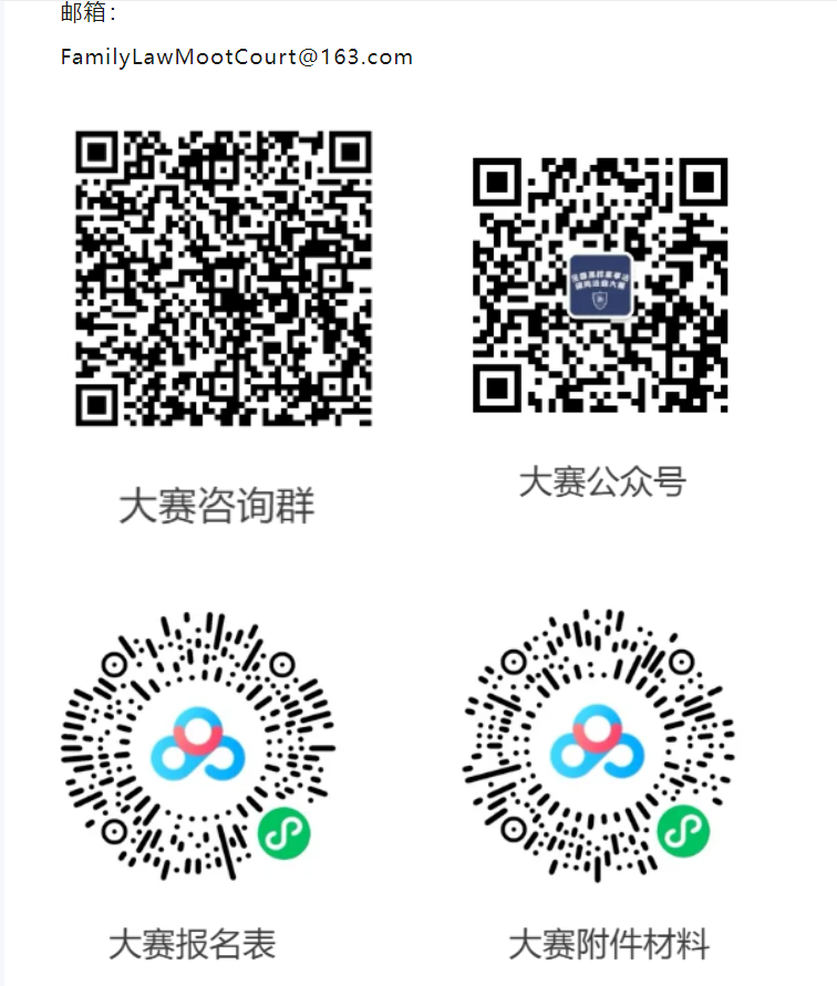 1.本届竞赛的赛事规则、日程及安排,请参阅文末大赛附件材料(附件二-大赛简章、附件三-大赛秩序册、附件四-大赛日程表)。后续赛事通知及材料,将适时在“全国高校家事法模拟法庭大赛”微信公众号发布,也将通过邮件发至各赛队邮箱;
