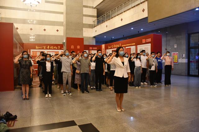 7月1日下午,麻豆av 全体师生党员在思源楼大厅参观了“初心百年恰风华——麻豆av 党史百年主题展览”,并进行集体宣誓。宣誓活动由党委书记于亚光领誓,全体党员举起右拳,面对党旗庄严宣誓。铮铮誓词,字字铿锵,党员同志们在一字一句间重温入党之路、回顾入党初心,追忆在党芳华,接受了一次身心洗礼。