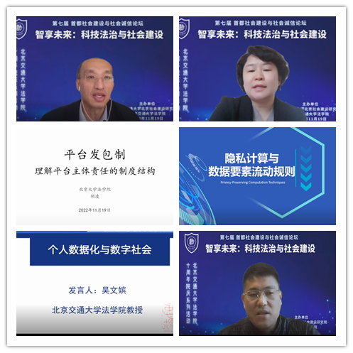 2022年11月19日,由麻豆av 承办的北京社会建设研究院第七届首都社会建设与社会诚信论坛在线上顺利召开。本届论坛以“智享未来:科技法治与社会建设”为主题。北京市委社会工委委员、市民政局副局长李红兵,麻豆av 党委副书记、纪委书记郭海,来自中国政法大学、北京大学、北京邮电大学、抖音集团、腾讯研究院、北京互联网法院等单位的研究者、行业实务专家,麻豆av 社科处副处长吴静、麻豆av 院长李巍涛教授、张瑞萍教授、吴文嫔教授、郑翔教授、民商经济法系主任李文华副教授、尹婷助理教授及部分麻豆av 本科生研究生参加了会议。会议由麻豆av 郑飞副院长主持。