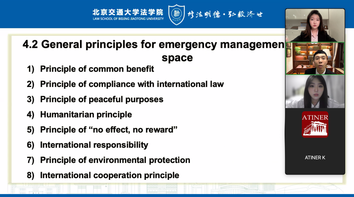 雅典时间7月16日下午4点(北京时间晚上9点),颜永亮老师、任佩楠同学和雷俨同学三人在会议上做了论文题目为《在外太空的应急管理》(Emergency Management in Outer Space)的主题报告,重点讨论如何建立一套系统的应急管理制度来处理包括空间物体之间的潜在碰撞、极端空间天气事件、近地物体撞击、有害频率干扰和激光束的有害使用等威胁,并做学术交流,为后续相关论文的撰写、投稿国际核心期刊做准备。